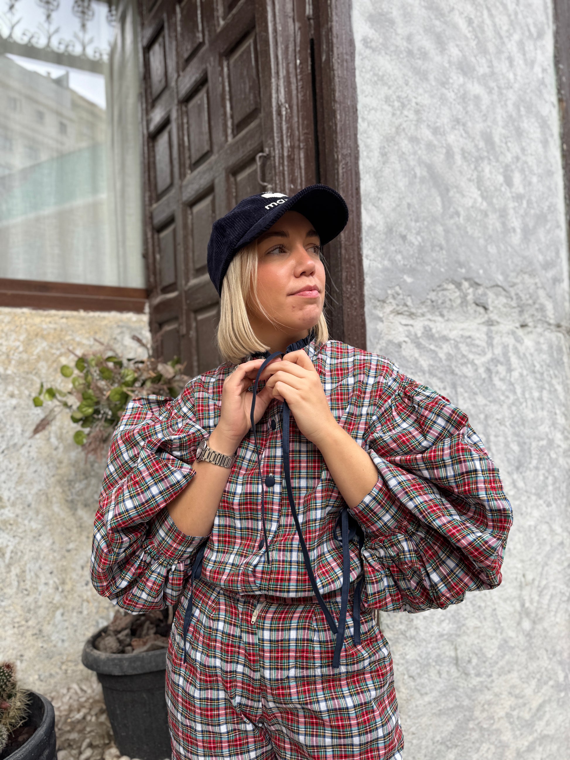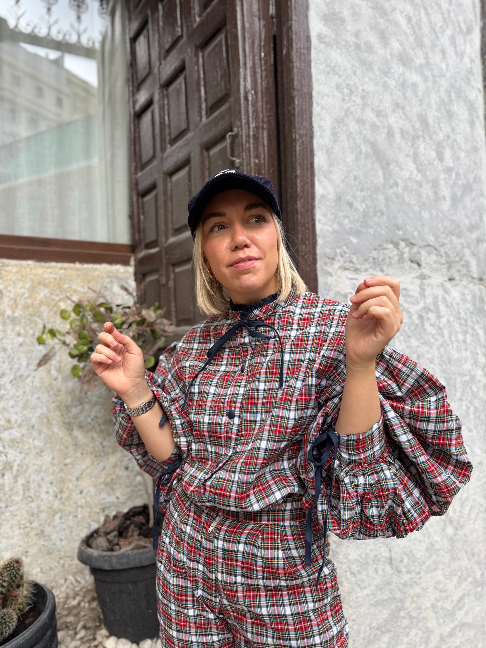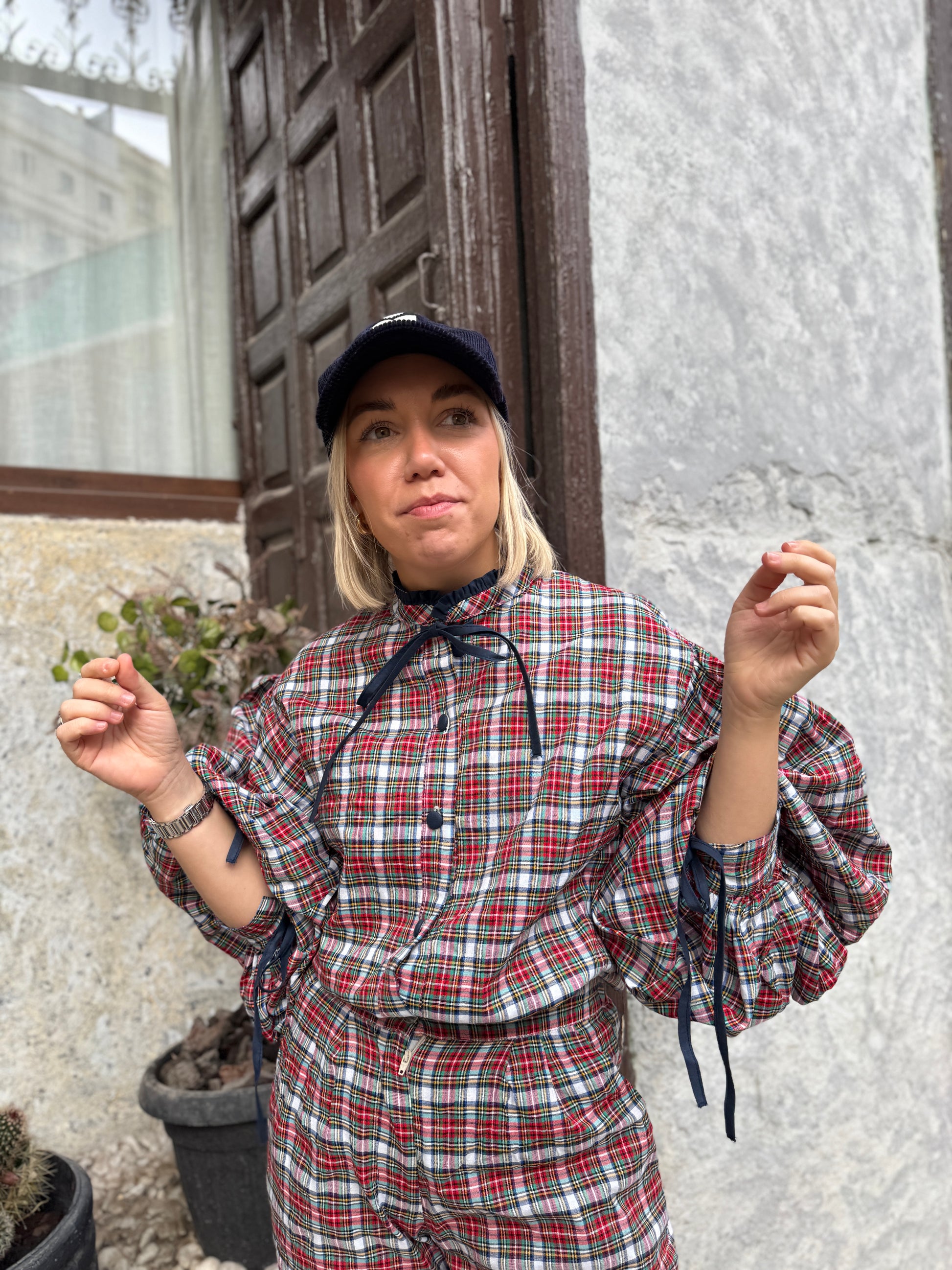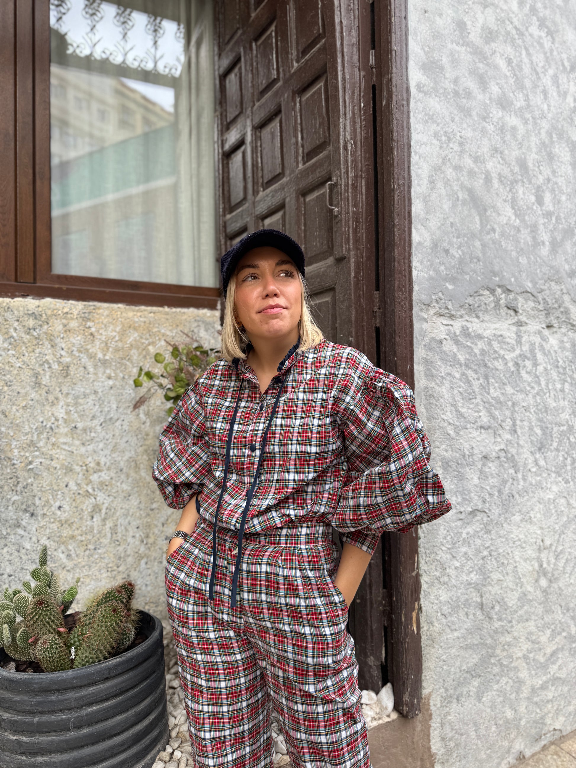 La blusa es el corazón del conjunto, con un toque distintivo: lazada al cuello y manga caída. Este detalle no solo es funcional, sino también un elemento de diseño que resalta y transforma la prenda en algo único. La blusa se acompaña de un pantalón a juego, cómodo y sofisticado, que complementa perfectamente el look.